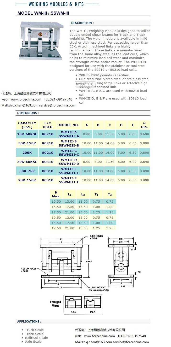 WM-III稱重模塊測力傳感器旨在利用雙頭剪力梁進行卡車和軌道稱重。稱重模塊可在低碳鋼或不銹鋼。容量大于50K, Artech加工鏈接強烈推薦。這些鏈接由與測壓元件相同的合金鋼制造,這有助于最大限度地減少測壓元件的磨損,并最大限度地提高整個安裝的強度。WM-III設計用于不銹鋼或工具鋼版本的80210或80310測壓元件。