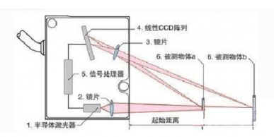 激光發(fā)射器通過鏡頭將可見紅色激光射向被測物體表面,經(jīng)物體反射的激光通過接收器鏡頭,被內(nèi)部的CCD線性相機接收,根據(jù)不同的距離,CCD線性相機可以在不同的角度下“看見”這個光點。根據(jù)這個角度及已知的激光和相機之間的距離,數(shù)字信號處理器就能計算出傳感器和被測物體之間的距離。